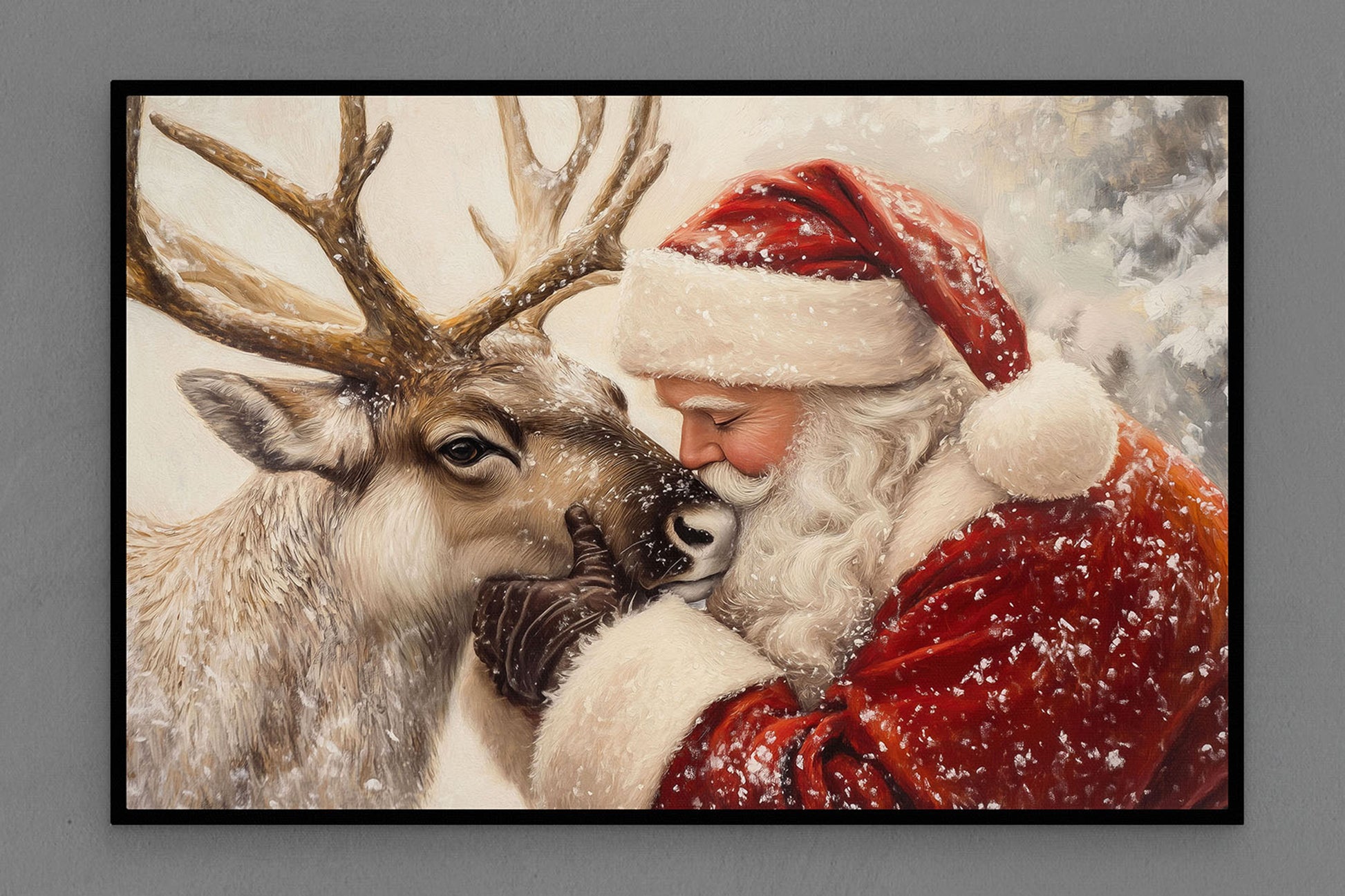 Canvas Frame with "Santa Claus and Reindeer Kiss" Image