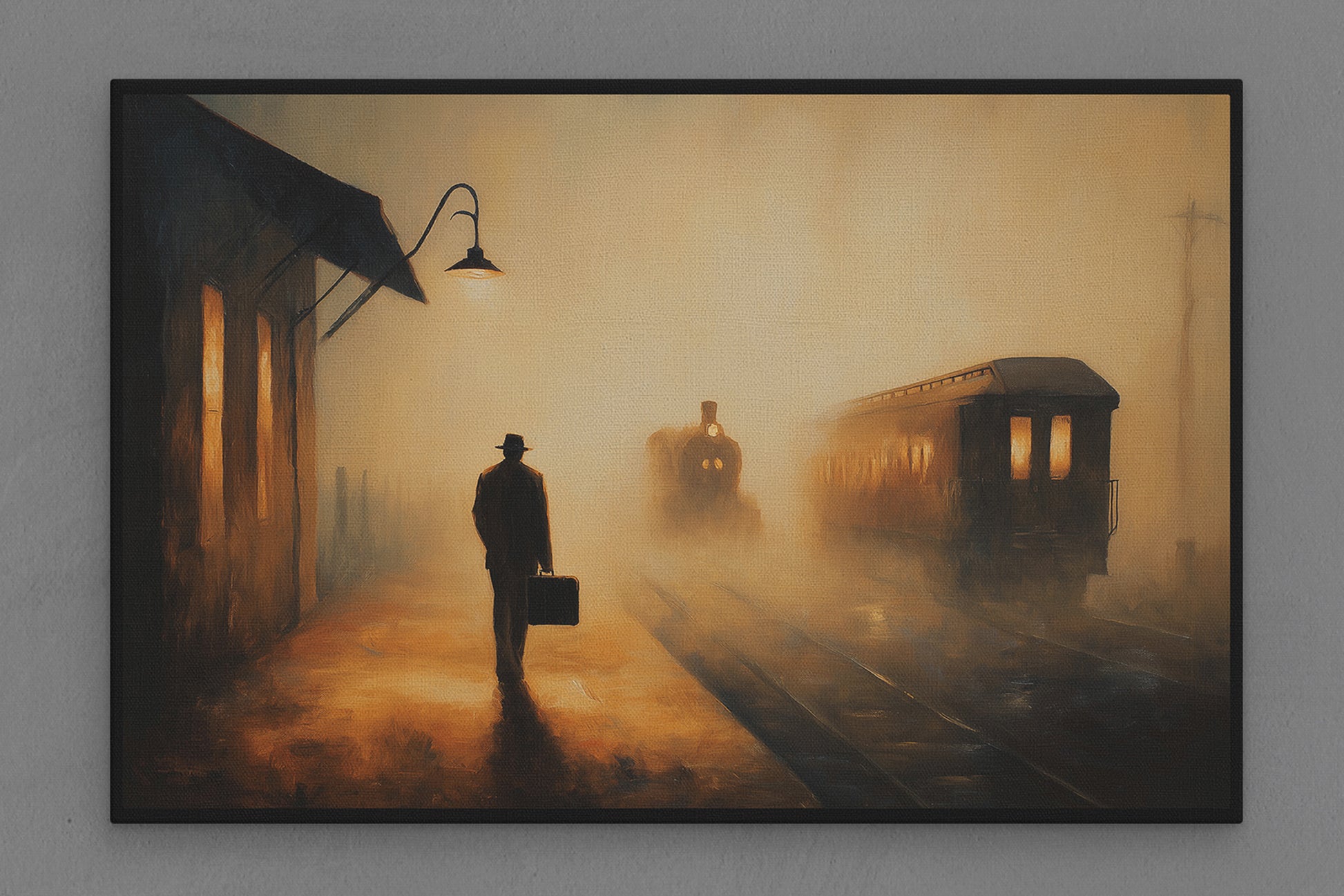 Canvas Frame with "Train Station with Man Waiting" Image