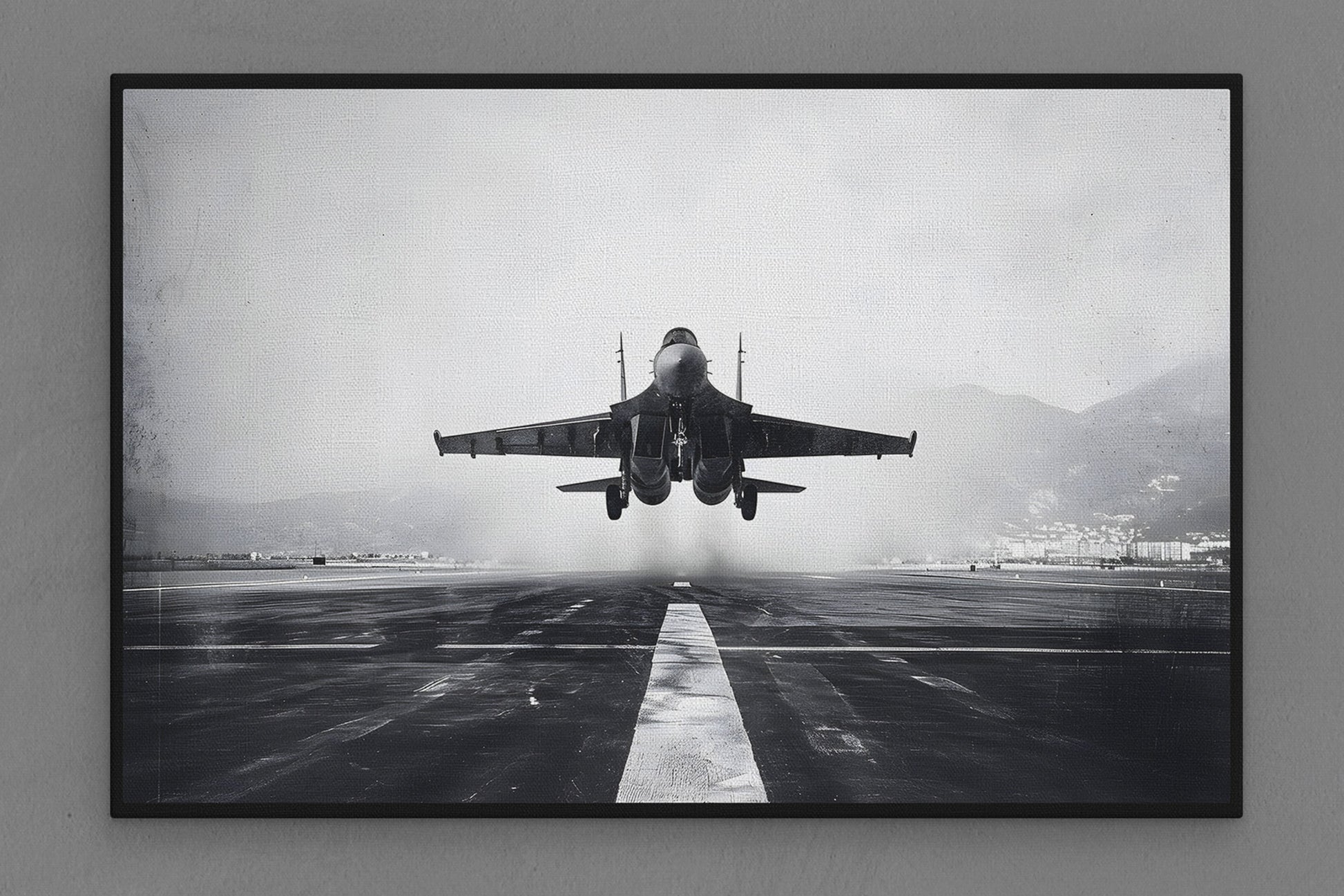 Canvas Frame with "Vintage Fighter Jet Taking Off" Image